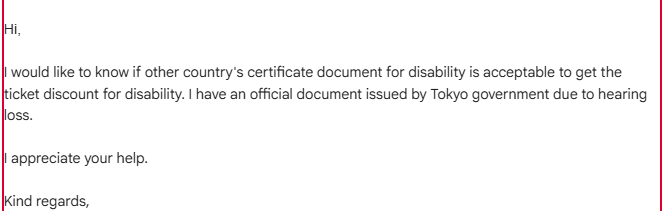 ざっくり訳すと「他国で交付された障害者手帳で、障害者割引を受けられるでしょうか」と書いています。