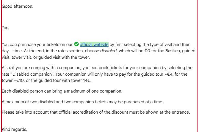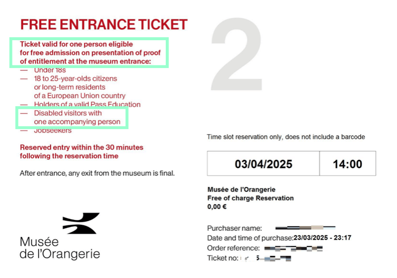 要約すると「Yes. チケット予約時に『障害者割引』を選べば0ユーロで予約ができます。証明する文書を当日、入口で見せなければならないことを考慮に入れてください」とのことでした。