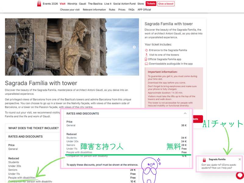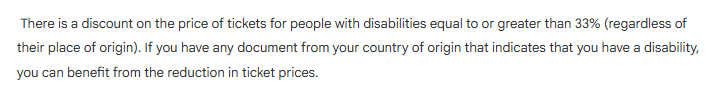 後から調べたところでは、やはりアルハンブラ宮殿と同じく「33%以上の障害を有する者」でないと割引にはならないとのことでした。